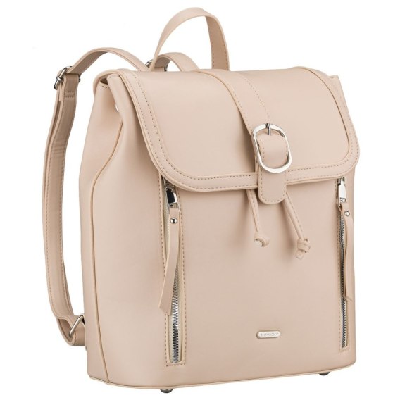 Plecak uszyty z wysokiej jakości skóry ekologicznej w beżowym kolorze. Jednokomorowy model zamykany klapką na magnes i suwakami. Wyposażony w wygodny uchwyt, nóżki na spodzie i regulowane szelki.