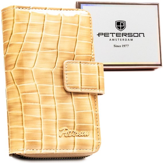 Beżowy portfel damski ze skóry ekologicznej z tłoczeniem na wzór skóry krokodyla, zamykany na zatrzask i suwak - Peterson