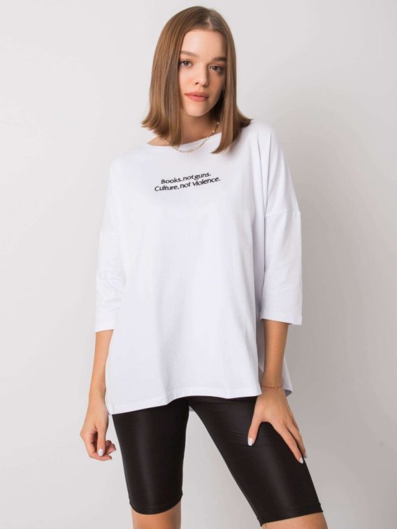 Biała damska bluzka z napisem.
