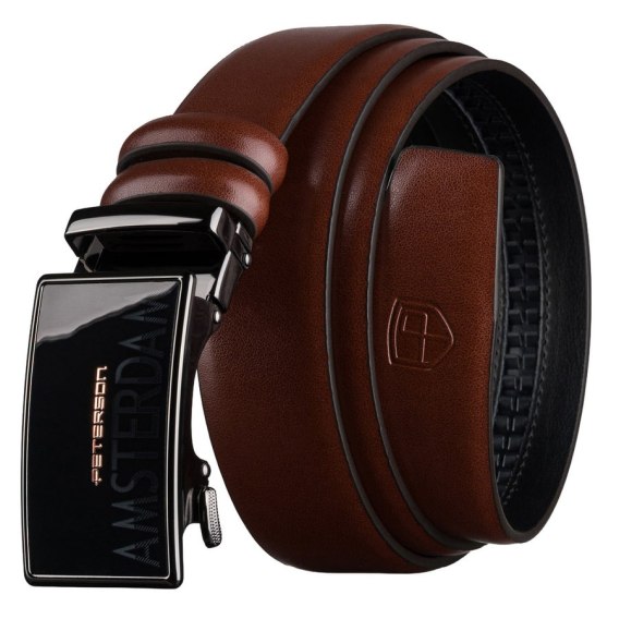 Brązowy, elegancki pasek męski ze skóry naturalnej z automatyczną klamrą - Peterson
