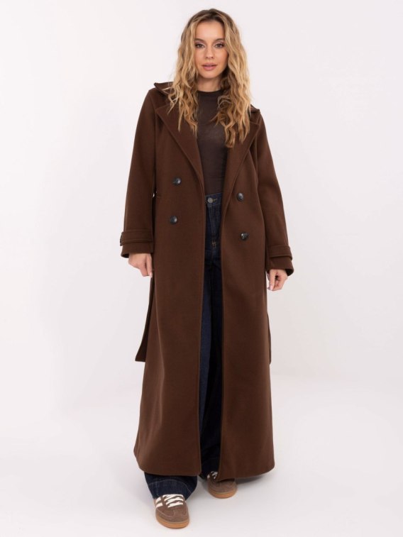 Brązowy elegancki płaszcz damski z dwurzędowym zapięciem – MAYA