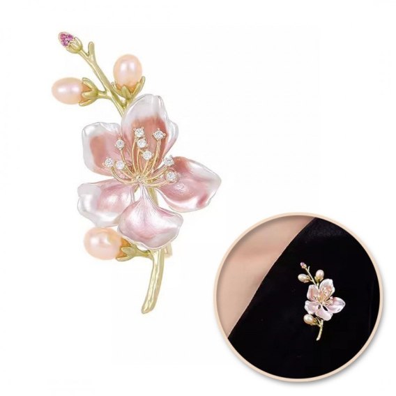 Broszka ozdobna delikatna, kwiat wiśni z kryształkami i perłami BZ204