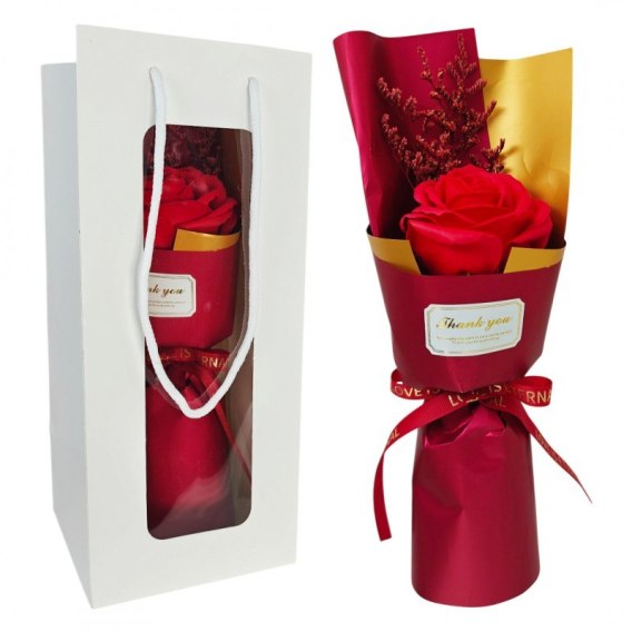 Bukiet z zapachową mydlaną różą w ozdobnym pudełkuSubtelny i wyjątkowy prezent dla kobiety, idealny na wiele okazji.Bukiet jest umieszczony w białym opakowaniu.Gotowy do wręczenia jako prezent dla Twojej ukochanej osoby.Każda róża mydlana jest starannie wykonana, aby oddać piękno prawdziwego kwiatu.Specyfikacja:Materiał: kwiaty mydlane/ kwiaty suszone.Materiał opakowania: tworzywo sztuczneWymiary pudełka:28cm x 12cm x 12cmWymiary bukietu:28cm x 8cm x 5cmWaga:22g waga bukietu61g waga brutto