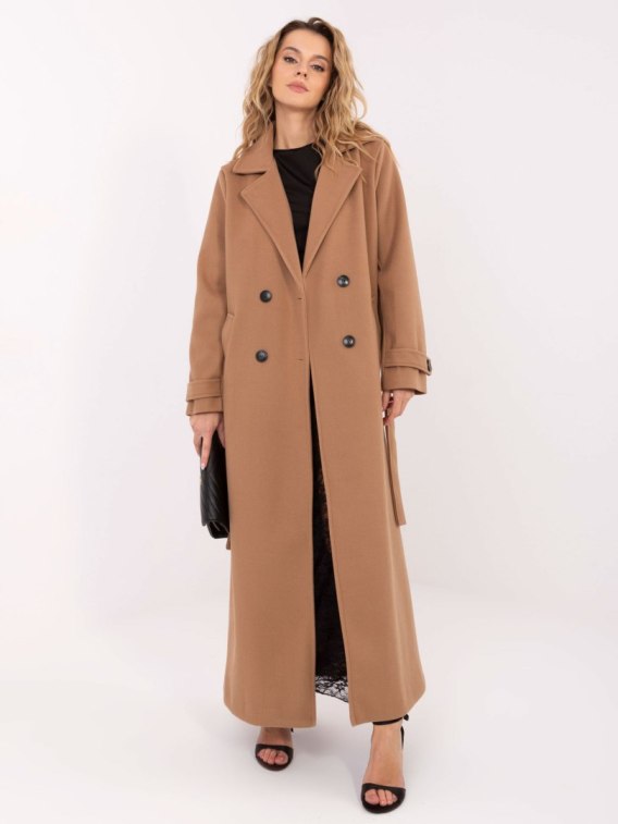 Camelowy elegancki płaszcz damski z paskiem – MAYA