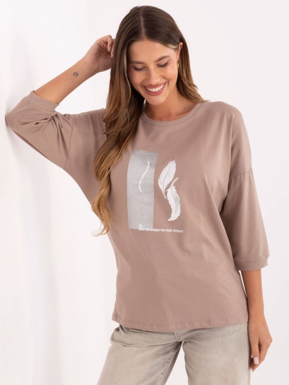 Ciemnobeżowa bluzka oversize z nadrukiem i rękawem 3/4 – Stylowy Wieszak