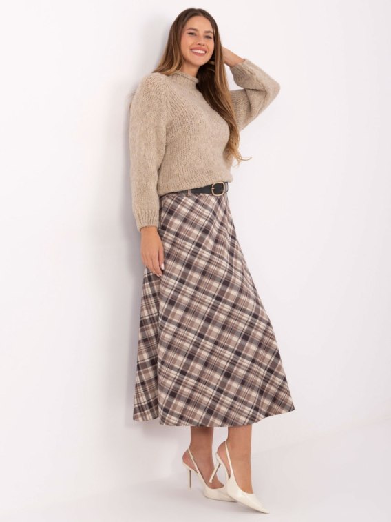 Ta ciemnobeżowa spódnica midi w kratę RUE PARIS to propozycja dla kobiet, które cenią klasykę połączoną z nowoczesnym wykończeniem.