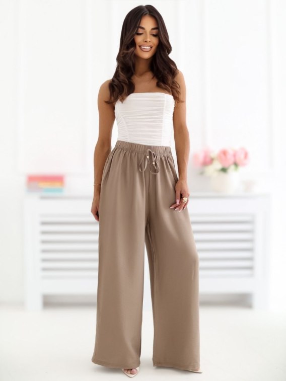 Ciemnobeżowe spodnie damskie wide leg z wysokim stanem i wiązaniem