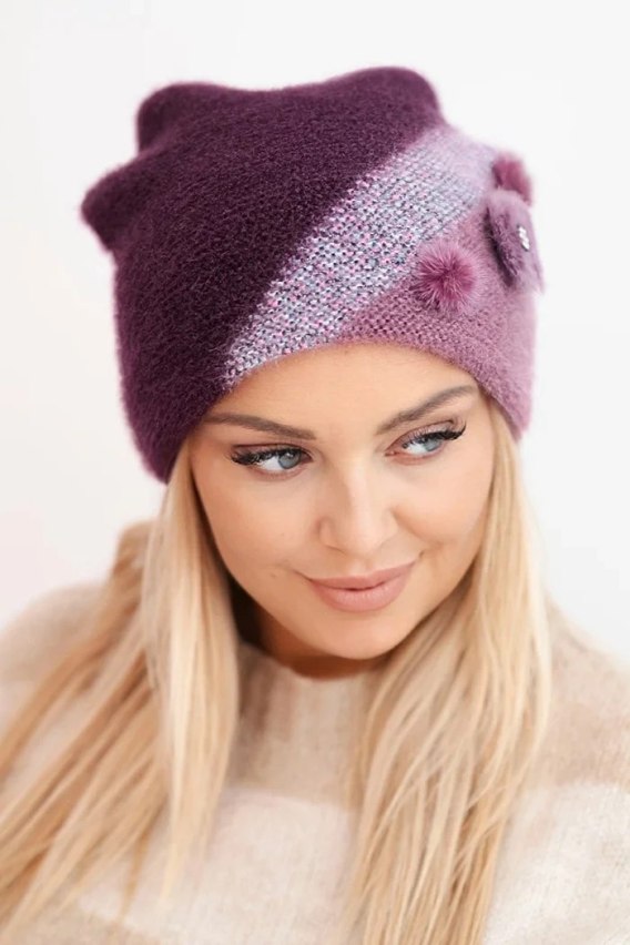 Czapka damska elegancka z futrzanymi ozdobami i brokatowym paskiem ciemno fioletowa