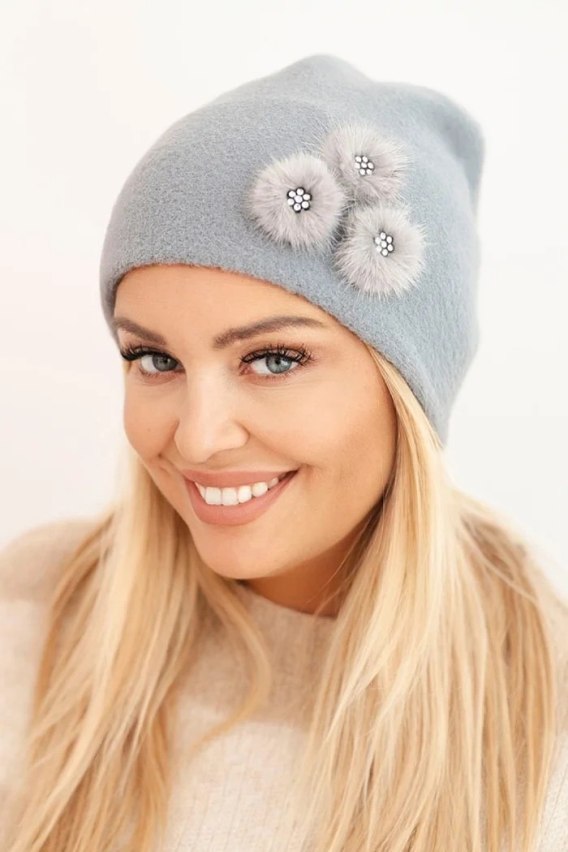 Czapka damska z ozdobnymi futrzanymi kwiatami – elegancka szara
