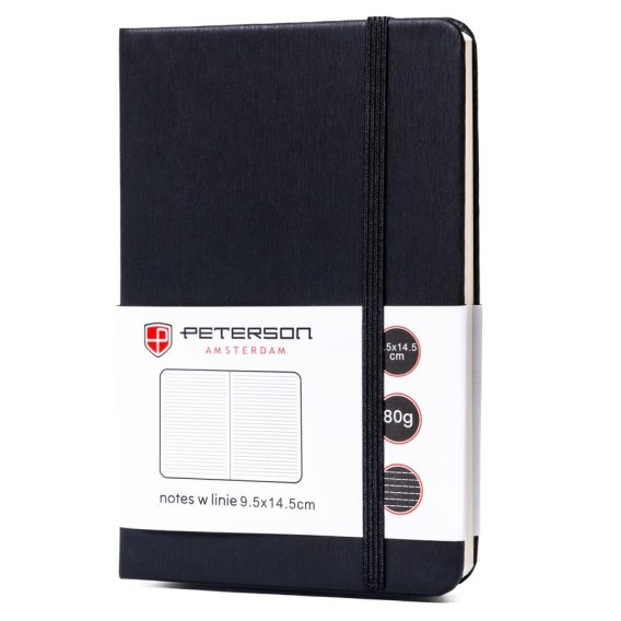 Czarny notes w formacie A6 zadrukowany w linie, wyposażony w gumkę zamykającą - Peterson
