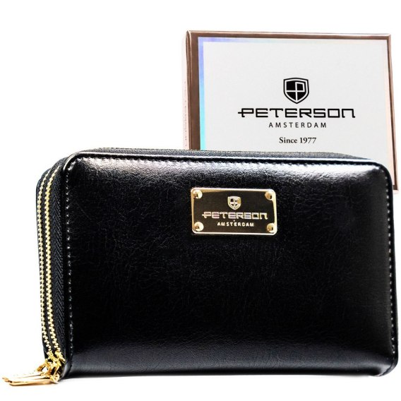 Czarny portfel damski w typie piórnika ze skóry ekologicznej wyposażony w system RFID - Peterson