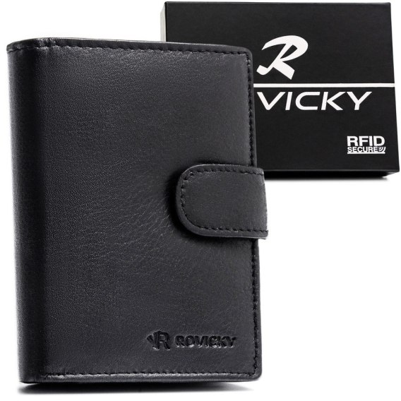 Czarny portfel męski ze skóry naturalnej mieszczący dowód rejestracyjny i wyposażony w system RFID - Rovicky