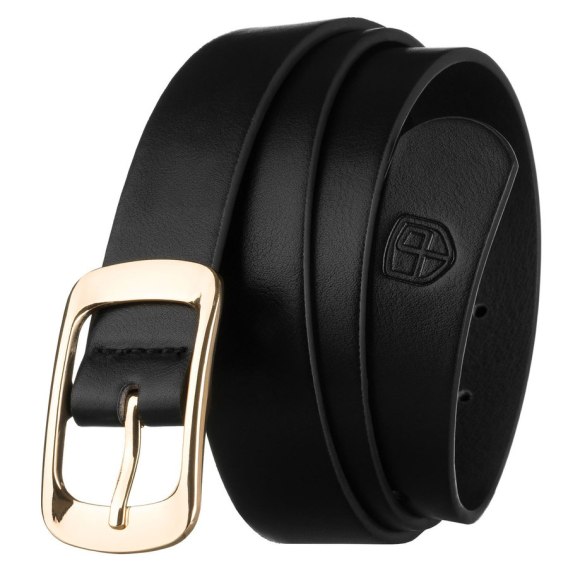 Czarny, wąski pasek damski ze skóry ekologicznej ze złotą klamrą - Peterson