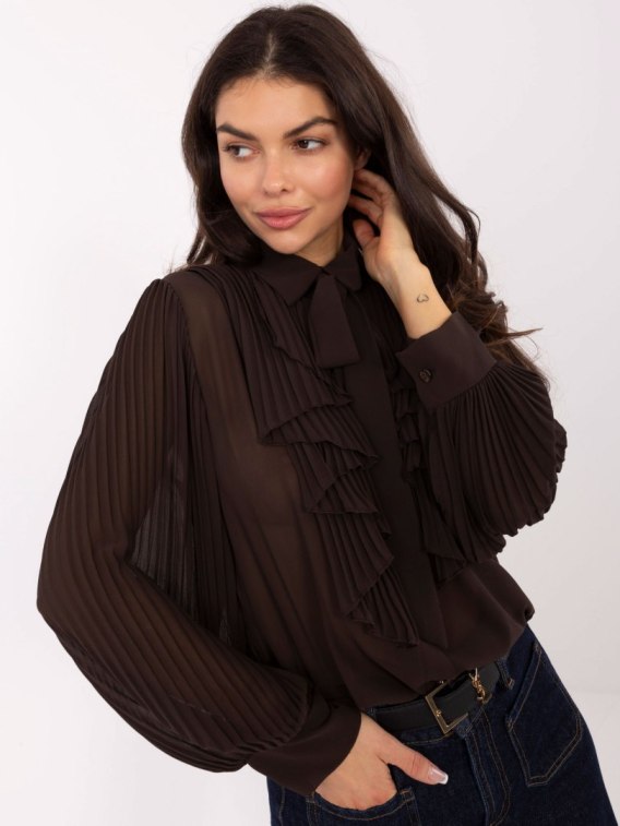 Czekoladowa koszula z żabotem i wiązaniem marki Italy Moda to idealny wybór dla kobiet, które cenią kobiecy styl, wygodę i ponadczasowy wdzięk.