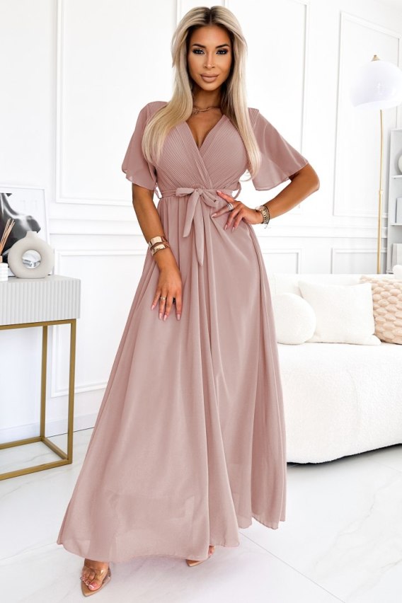 Długa sukienka z plisowanym dekoltem i wiązaniem – taupe – Numoco Basic