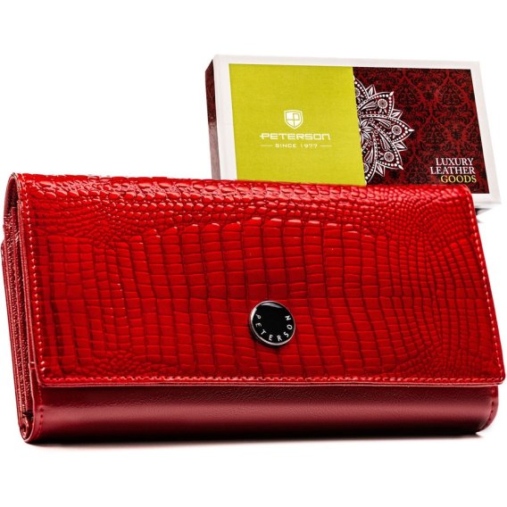 Portfel został zaprojektowany z myślą o kobietach, które cenią sobie zarówno estetykę, jak i praktyczność. Lakierowana skóra nadaje mu elegancki charakter, a tłoczenia inspirowane wzorem krokodyla dodają mu nowoczesnego, luksusowego wyglądu. Starannie dobrane detale, takie jak srebrny logowany suwak i logo PETERSON na froncie, podkreślają jego prestiż.