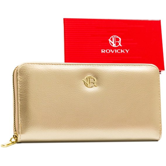 - Stylowe okucia | Bardzo dużym atutem portfela są dodatki w kolorze złotym: zamek błyskawiczny oraz logo marki Rovicky® na przednim panelu;