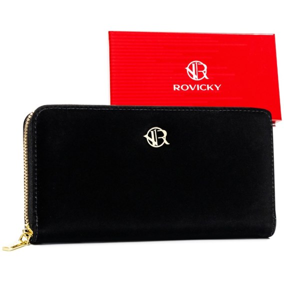 • Stylowe okucia | Bardzo dużym atutem portfela są dodatki w kolorze złotym: zamek błyskawiczny oraz logo marki Rovicky® na przednim panelu;
