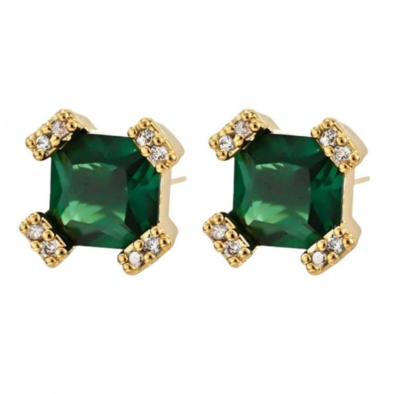 Te wyjątkowe kolczyki damskie wykonane ze stali chirurgicznej pozłacanej 14k złotem to połączenie subtelności i nowoczesnego designu. Centralnym elementem jest zielony kamień w szlifie kwadratowym, którego blask podkreślają błyszczące cyrkonie umieszczone w rogach oprawy. To biżuteria, która przyciąga spojrzenia i dodaje szyku każdej stylizacji.