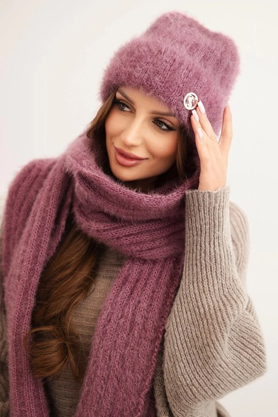 Komplet damski czapka i długi szalik z miękkiej przędzy ciemno różowy
