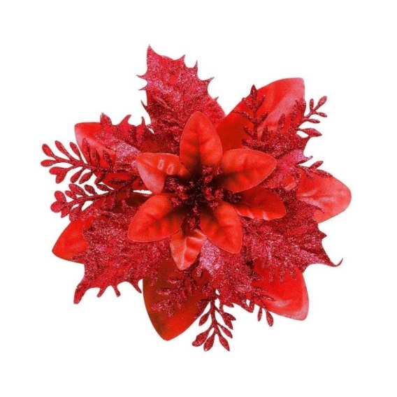 Czerwony kwiat na choinkę z brokatem WOZ04CZE to elegancka ozdoba świąteczna, która podkreśli tradycyjny charakter dekoracji i doda im wyjątkowego blasku.