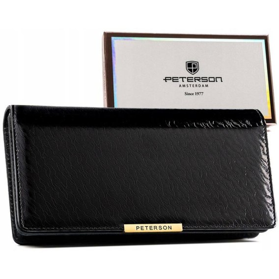 Lakierowany portfel damski ze skóry ekologicznej w czarnym kolorze zamykany na zatrzask i suwak - Peterson