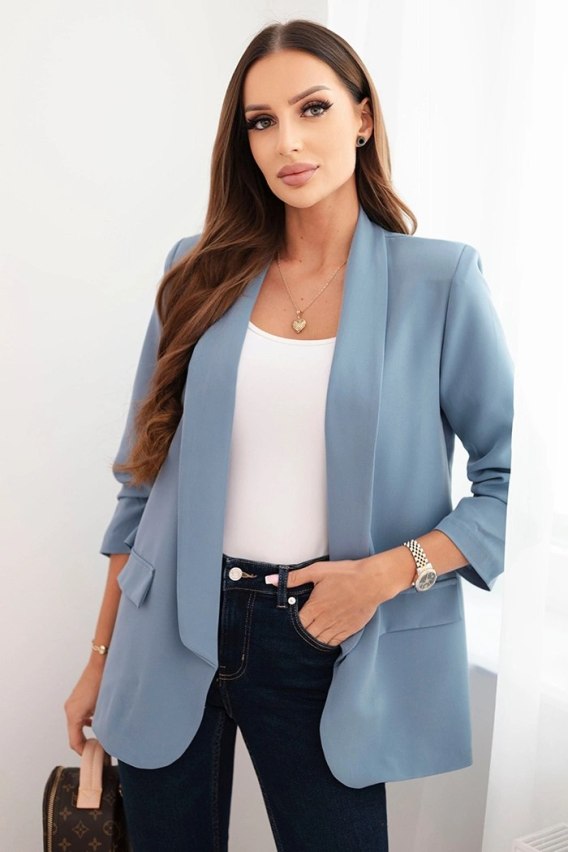 Marynarka damska w kolorze jeansowym bez zapięcia z podszewką. Włoski fason i klasyczny krój – idealna do pracy i codziennych stylizacji.