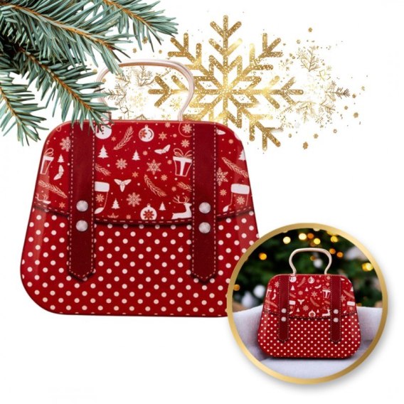 Metalowy pojemnik na cukierki KSN164 w intensywnej czerwieni z motywami bożonarodzeniowymi to idealny sposób na przechowywanie słodyczy i dekorację wnętrza.