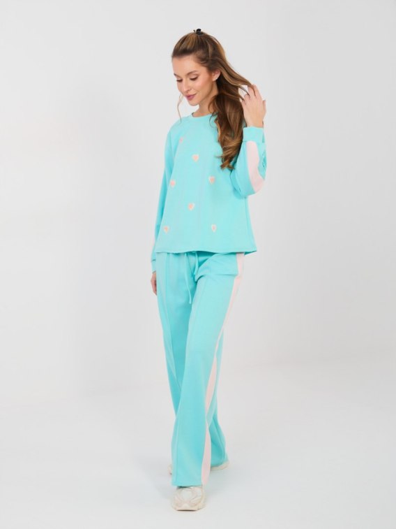 Miętowy komplet RUE PARIS to idealne połączenie komfortu i kobiecego stylu. Bluza z delikatnymi serduszkami oraz spodnie z szeroką nogawką i lampasami tworzą nowoczesny zestaw na co dzień.