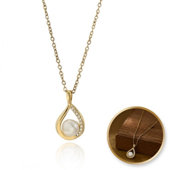 Pozłacany naszyjnik ze stali szlachetnej z delikatną zawieszką w kształcie kropli to biżuteria, która łączy klasykę z nowoczesnym stylem. Wewnątrz zdobi go połyskująca perła, a całość uzupełniają drobne, błyszczące cyrkonie. To idealny dodatek zarówno na co dzień, jak i na wyjątkowe okazje.