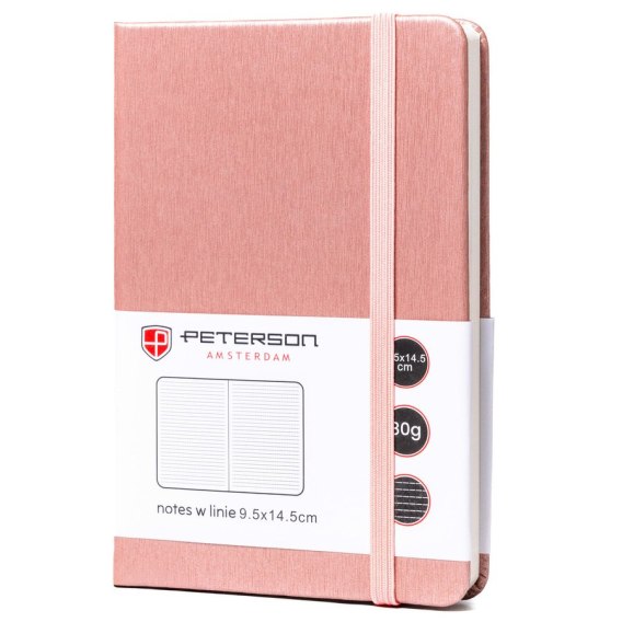 Notes w formacie A6 w różowym kolorze, zadrukowany w linie i wyposażony w gumkę zamykającą - Peterson