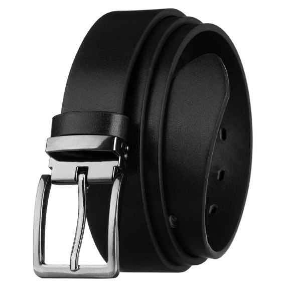 Pasek męski ze skóry ekologicznej w czarnym kolorze, zakończony srebrną, klasyczną klamrą