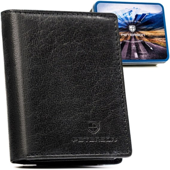 Pionowy portfel męski ze skóry naturalnej w czarnym kolorze, model bez zapięcia zewnętrznego - Peterson