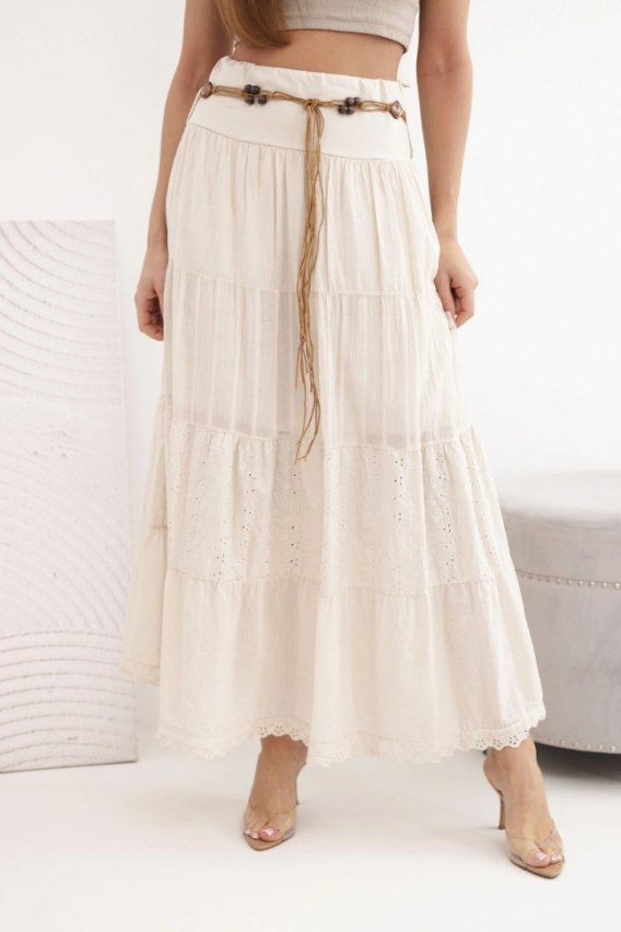 Spódnica damska maxi bawełniana z ażurowym haftem i elastycznym pasem beżowa