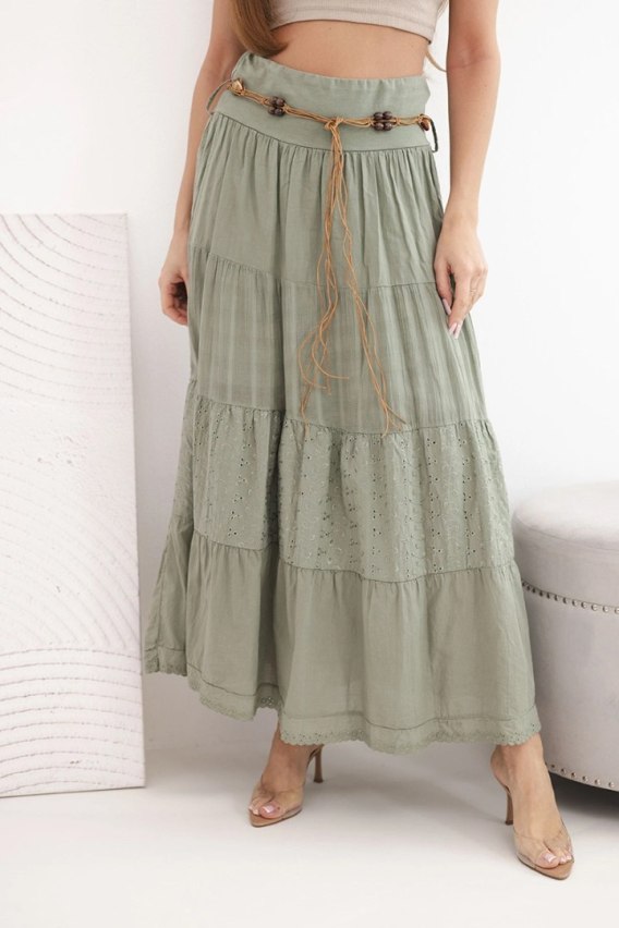 Spódnica damska maxi bawełniana z ażurowym haftem i elastycznym pasem khaki