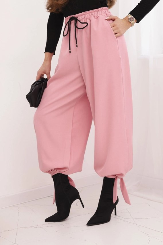 Spodnie damskie z szeroką nogawką i wiązaniem u dołu – jasno różowe