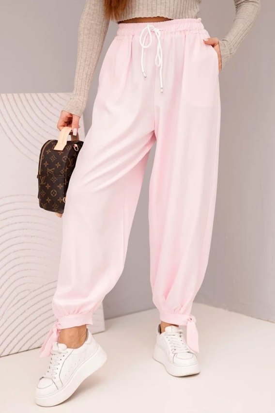 Spodnie damskie z szeroką nogawką i wiązaniem u dołu – cukierkowy róż