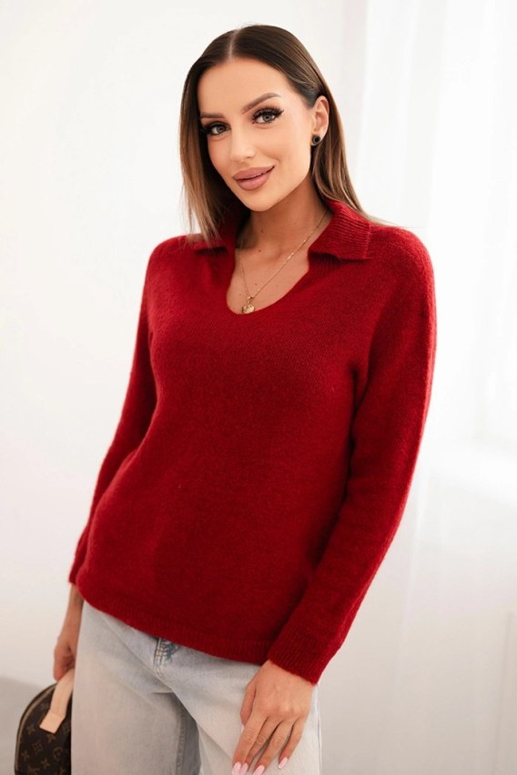 Sweter damski z baby alpaki z kołnierzem i dekoltem V – bordowy